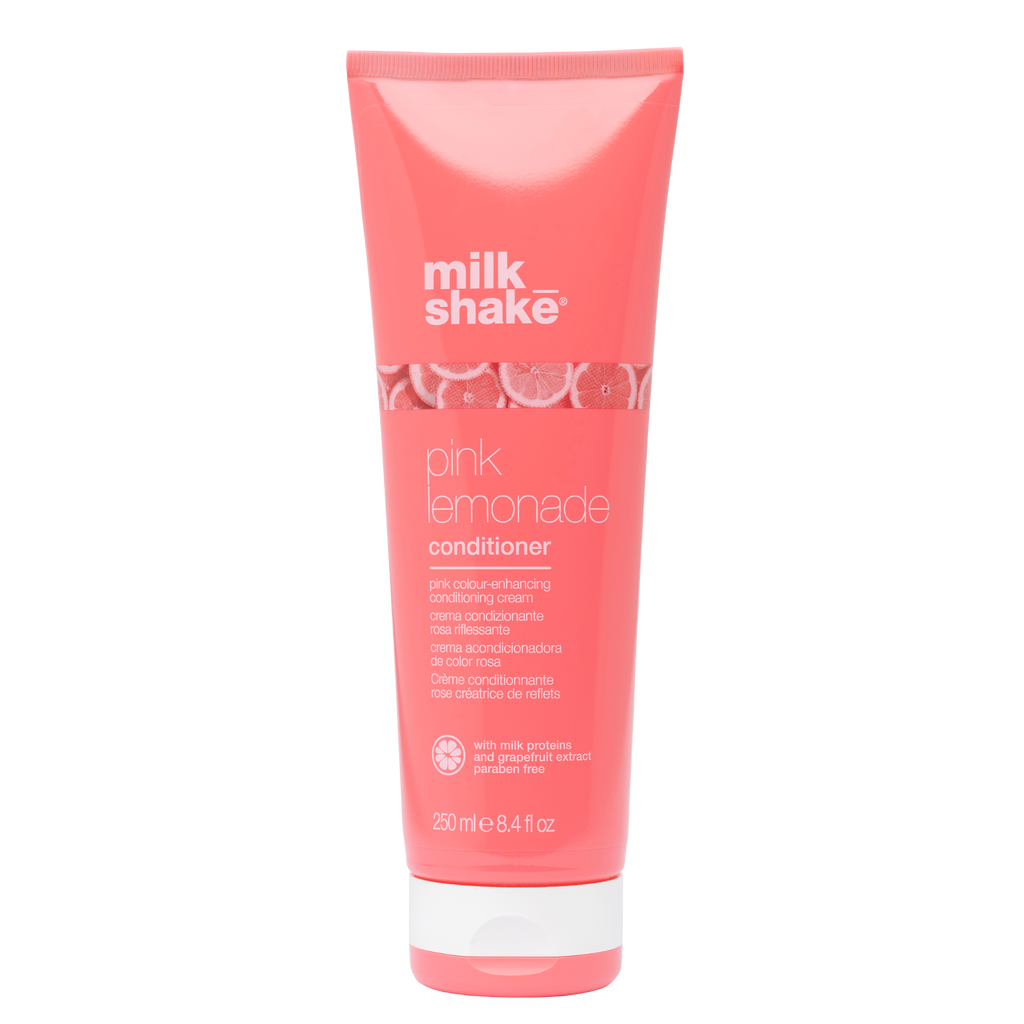 milk_shake Pink Lemonade Conditioner is a creative conditioning formula for blonde, lightened, or white hair. It moisturizes and nourishes the hair while adding a delicate, temporary pink color. This conditioner is perfect for achieving a fun, pastel pink lemonade shade that gradually washes out.